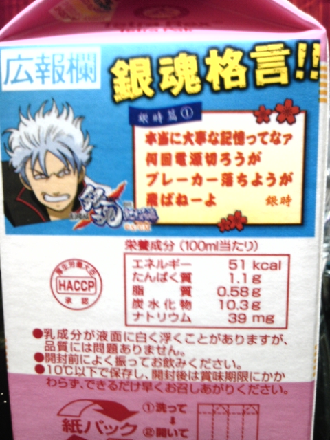 ・銀魂×明治乳業の製品(いちごオ・レ)を購入、クイズに片っ端から挑戦し、待受をGet、すかさず銀さんを待受に設定